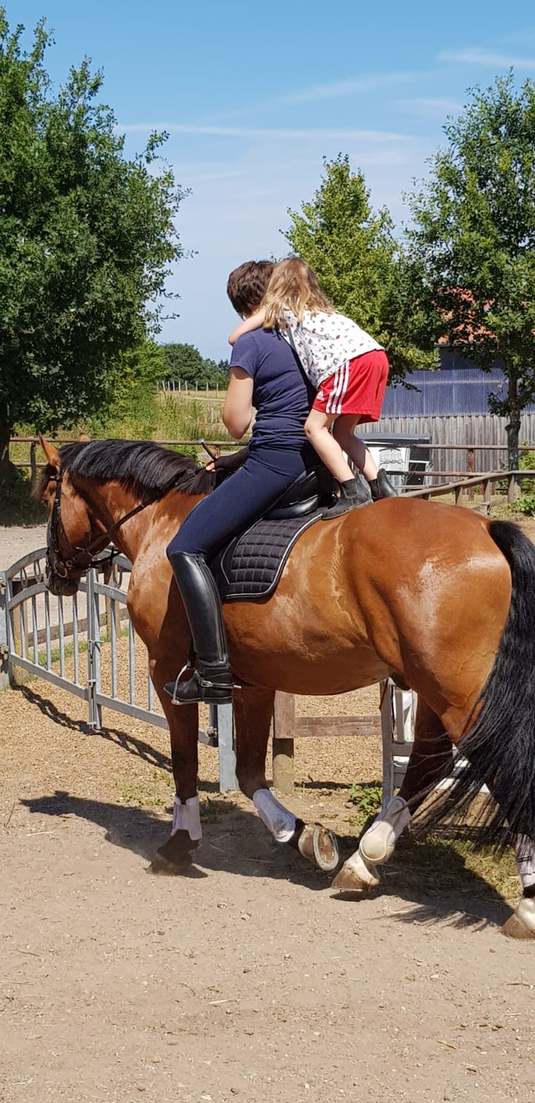Die zwei haben uns dann im Stall besucht bei ihrem Spaziergang mit Hund Yuna und schwubs saß mein kleiner Linus auf Highway und ritt mit Mutti zum Stall. Ich bin mir sicher, dass er nicht verstanden hat, was da passiert ist, aber er fand es in jedem Fall gut.