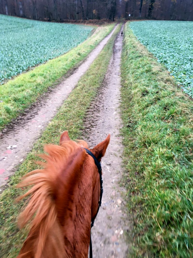 Mit Krümel ging es dann für eine gute Stunde zur dressurmäßigen Ausfahrt ins Gelände. Welch ein Geschenk solch entspannte Pferde zu haben!